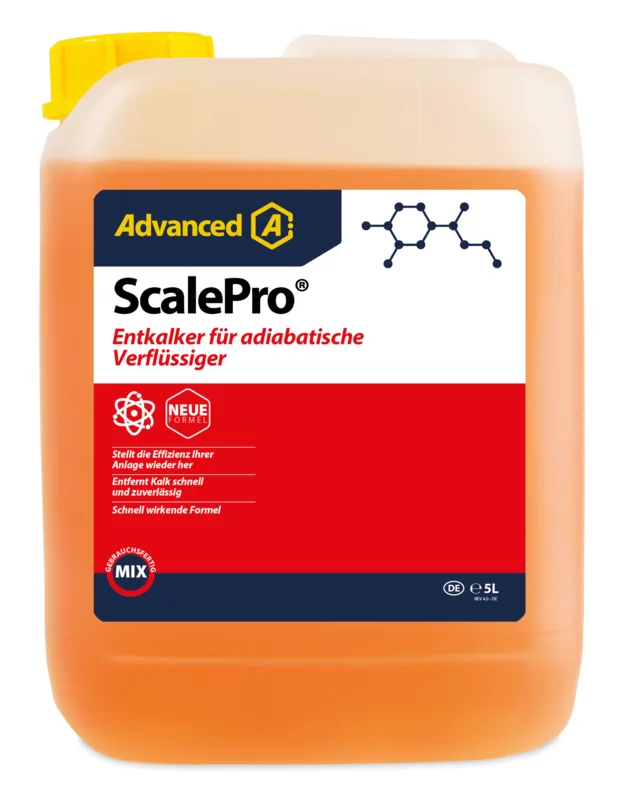 ScalePro von Advanced Engineering ist ein gebrauchsfertiges Entkalkungsmittel im 5-Liter-Kanister, das speziell für die rasche und effektive Entfernung hartnäckiger Kalkablagerungen entwickelt wurde. Dieses Spezialprodukt ist ideal für adiabatische oder wassergekühlte Verflüssiger und Klimaanlagen, insbesondere in Regionen mit hartem Wasser. Kalkablagerungen auf diesen Systemen können die Effizienz stark beeinträchtigen und lassen sich oft nicht mit herkömmlichen Reinigern entfernen. ScalePro stellt die ursprüngliche Systemleistung wieder her und verlängert die Lebensdauer der Anlage.