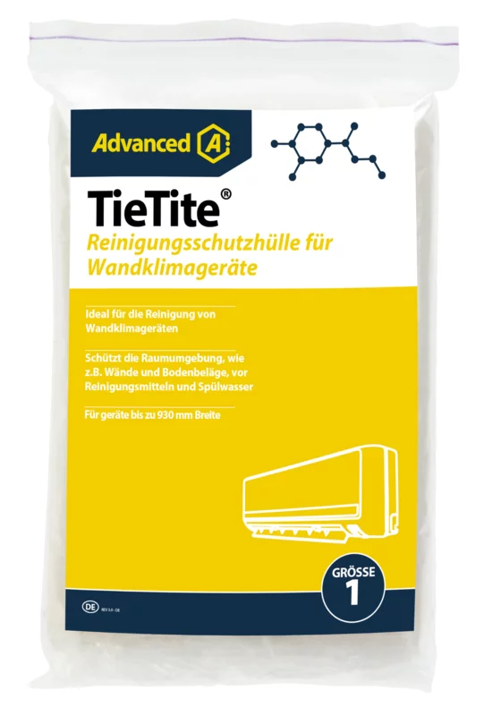 Die TieTite Reinigungsschutzhülle der Größe 1 ist das professionelle Werkzeug zur sauberen und unkomplizierten Wartung von Klimaanlagen in Innenräumen. Bei der Reinigung der Verdampferspulen von Split-Geräten mit Hochdrucksprühern oder manuellen Methoden ist die Gefahr von Spritzern und Schmutzwasser auf empfindliche Oberflächen hoch. Die robuste und wasserabweisende TieTite-Hülle fängt das gesamte Schmutzwasser zuverlässig auf.