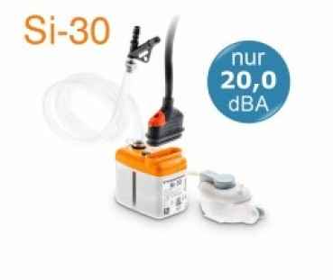 Sauermann Kondensatpumpe Si-30, 20 l/h, 20 db(A)Die Si-30 ist eine leistungsstarke Kondensatpumpe für Klimagerätemit bis zu 20 kW Leistung.Die patentierte Schwingkolbentechnologie, die im Gegensatz zuanderen Schwingkolbenpumpen beide Halbschwingungen desWechselstroms nutzt führt nicht nur zu unerreicht hoher Leistung,sondern durch die Magnetfeld-Abfederung des Schwingkolbensauch zu hervorragender Laufruhe und sehr leisem Betrieb, sowohlim Teillast- als auch im Vollastbetrieb, bei großen Saug- undFörderhöhen.Die Si-30 besteht aus einem Pumpen- und einem Schwimmermodul.Der dreistufige Schwimmerschalter (Ein/Aus/Alarm) steuert dieKondensatpumpe. Wird das maximal zulässige Kondensatniveauüberschritten (Alarm) schließt ein potentialfreier Kontakt, der zurAbschaltung des Klimagerätes verwendet werden kann.Die Kondensatpumpe ist weitgehend unempfindlich gegenVerschmutzungen und kann angesaugte kleine Schmutzpartikelim Kondensat problemlos ausstoßen.Vorteile der Si-30:- patentierte Schwingkolbentechnologie- Belüftungsventil 'Drain Safe' erhöht die Lebensdauer der Pumpe- niedriges Geräuschniveau: 20dBA- hohe Saug- und Föderhöhen möglich- verriegelbares Steckerkabel- hohe Zuverlässigkeit- einfache MontageLieferumfang:- Pumpenblock- 1m Druckschlauch 6mm mit montiertem Belüftungsventil ""Drain Safe""- vibrationsdämpfende Halterung- 1.5 m Steckerkabel mit Verriegelung: 2 Adern für Stromversorgung- 6 Kabelbinder 2.5 x 100mm- Schwimmerschalter (SI2958, 1.5m Kabel)- Kautschukbogen 90° 15 x 60mm- Entlüftungsschlauch 4 x 75 mm--- Technische Daten ---Versorgungsspannung V/PH/Hz230/1/50Max. Fördermenge l/h20Maximale Förderhöhem10Maximale Saughöhem3Geräuschpegel max.db(A) in 1m20Alarmkontakt A8Abmessungen Pumpe LxBxHmm66x43,5x60Abmessungen Sensor LxBxH mm55x38x37,5Schaltpunkte Sensor:Ein:16 mmAus: 11mmAlarm:19 mm--- Video ---