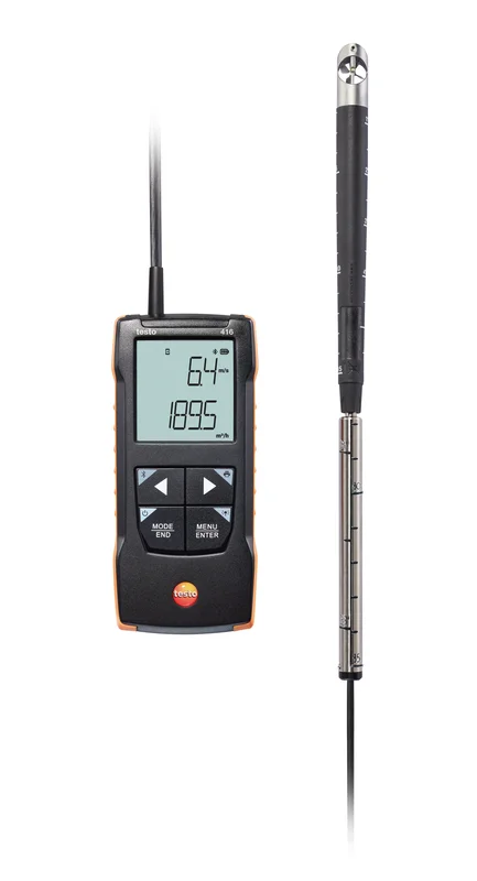 testo 110 - NTC und PT100 mit AppDas kompakte 16 mm-Flügelrad-Anemometer testo 416 mit Teleskopsonde und App-Anbindung eignet sich ideal für die einfache, schnelle und präzise Ermittlung von Strömungsgeschwindigkeit und Volumenstrom in Lüftungskanälen von Klima- und Lüftungsanlagen. Die Anbindung an die testo Smart App ermöglicht Konfiguration, Anzeige (auch als Second Screen) und Speicherung sowie Dokumentation der Messwerte direkt in der App.Mit dem kompakten 16 mm-Flügelrad-Anemometer testo 416 mit Teleskopsonde und App-Anbindung erledigen Sie Strömungsmessung im Lüftungskanal von Klima- und Lüftungsanlagen einfach, schnell und präzise. Das integrierte Teleskop lässt sich auf bis zu 850 mm ausziehen und erleichtert so die Arbeit über Kopf oder in Kanälen mit großem Durchmesser. Damit Sie sofort alle relevanten Informationen parat haben, berechnet das testo 416 zeitliche und punktuelle Mittelwerte sowie den Volumenstrom automatisch. Und dank des kompakten Designs und des robusten Gehäuses kann es mit dem Flügelrad-Anemometer auch mal etwas rauer zugehen.Konfiguration des Messgerätes, Anzeige und Speicherung der Messwerte sowie Dokumentation erledigen Sie besonders komfortabel mit der testo Smart App. Diese macht aus Ihrem Smartphone auch ein zweites Display.